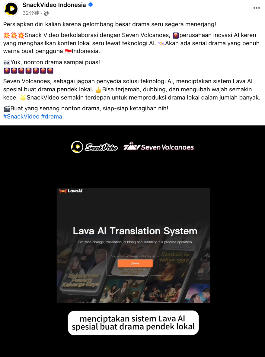 Seven Volcanoes作为SnackVideo的AI视频内容战略合作伙伴,通过前沿 AI 技术,实现海量内容的本地化,将为印尼用户带来精彩纷呈的短剧内容,助力SnackVideo的平台内容生态建设,开启新的探索之路。