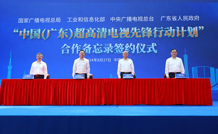 8月27日,国家广播电视总局、工业和信息化部、中央广播电视总台与广东省人民政府在广州国际媒体港正式签订“中国(广东)超高清电视先锋行动计划”合作备忘录,将共同推进广播电视和网络视听超高清端到端全链条优化升级。